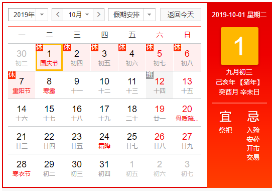 2019年10月1日至10月7日放假,共7天。其中,10月5日(星期六)、10月6日(星期日)、10月7日(星期一)為國慶節(jié)法定節(jié)假日