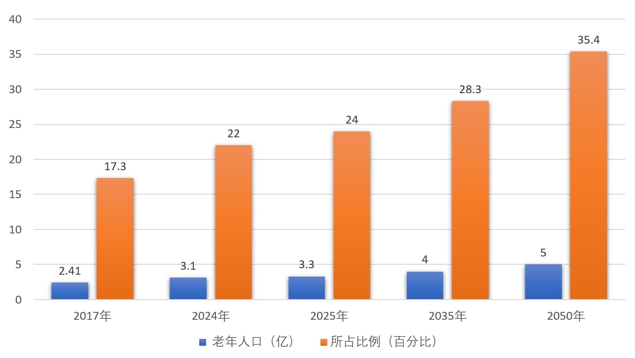 我國確立了“以居家為基礎、社區為依托、機構為支撐”的養老產業框架和9073養老格局,90%居家養老;2025年1月17日,國家統計局發布,截至2024年底,我國60歲及以上老年人口有3.1億人,占總人口22%,其中,65歲及以上人口超2.2億人,占15.6%。2035年左右我國60歲及以上老年人口將突破4億,在2050年前后達到頂峰,約占總人口的1/3。那時,中國將有4.8億、甚至接近5億老年人,是世界上老年人口最多的國家。養老服務業目前已達10萬億市場規模。